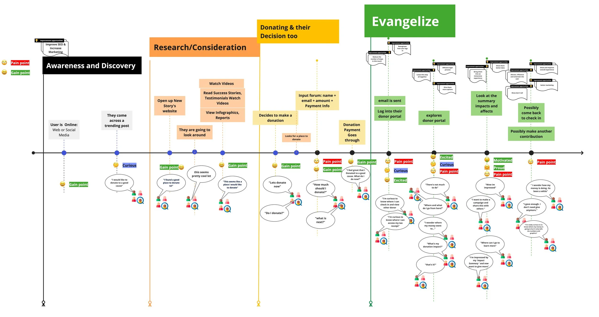 In the quest to deeply understand and empathize with the users, I embarked on a comprehensive research journey, focusing on a diverse audience ranging in age from 18 to 60, with a significant portion between 18 and 30 years old. This demographic consists of donors who contribute between $1 and $1000, often on a monthly basis, and are most active on social media and the dashboard. To grasp the nuances of their experiences and challenges, I developed a journey map.